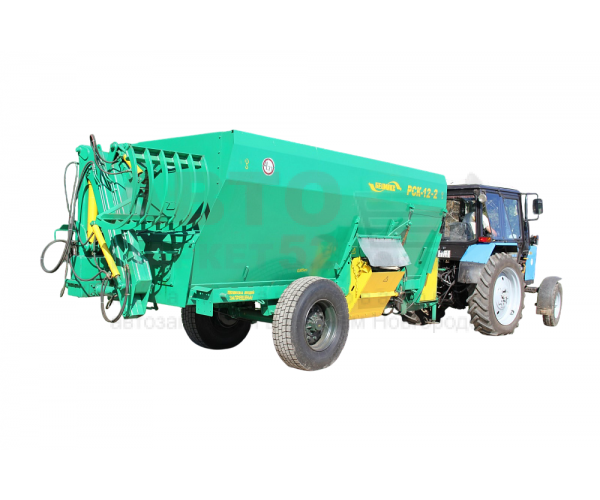 Кормораздатчик РСК-12-3 предназначен для измельчения (доизмельчения) и смешивания из различных компонентов (корнеклубнеплоды, комбикорма, сено, солома, сенаж и др.), транспортировки и раздачи сбалансированного корма на кормовой стол или в кормушки высотой не более 0,75 м., а так же самозагрузки стебельчатых кормов с помощью грейферного загрузчика.